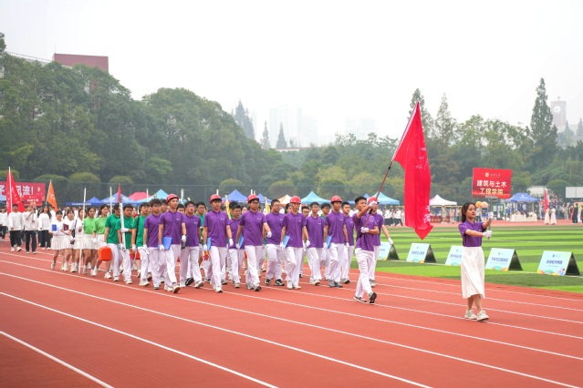 整齐划一,铿锵有力。管理学院踏着矫健的步伐走向主席台,他们坚毅的目光充满不灭的斗志,由数名同学拼起的院徽展现了他们团结一致的比赛精神;英姿飒爽,机械工程学院穿着整齐的服装出场,他们气宇轩昂,展现出青年的坚毅与顽强;舞态生风、青春飞扬,音乐与舞蹈学院以蓬勃的朝气前行,他们用曼妙的舞姿彰显青春活力,舞动青春风采……最后出场的是国际教育学院,来自7个国家的240名国际交流生挥舞着手中的五星红旗和本国国旗,他们将用运动架起沟通的桥梁,用热情点燃友谊之火。少年自有少年强,各学院方队代表队步伐整齐划一,秉持着“比赛第一,友谊第二”的宗旨和“更高,更远,更强”的目标,以独特的方式彰显学院特色,为运动会添上浓墨重彩的一笔。