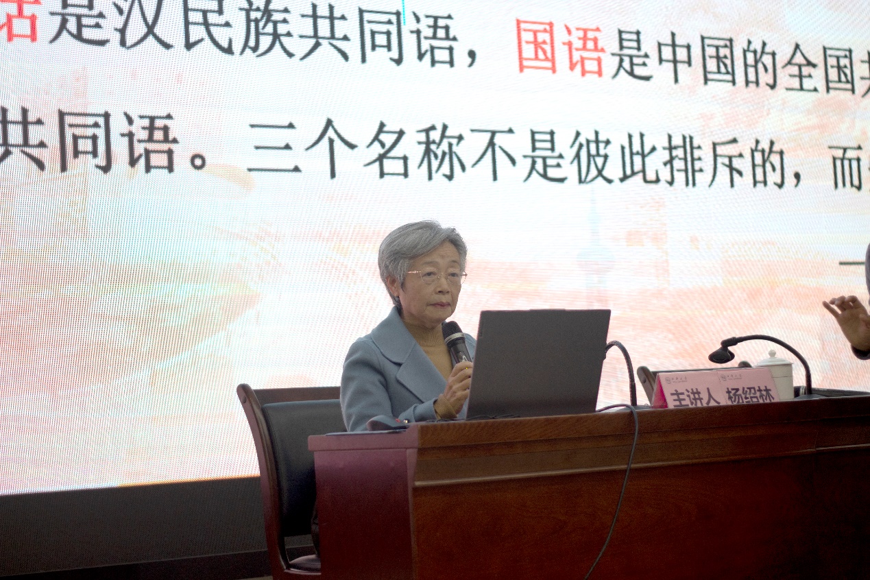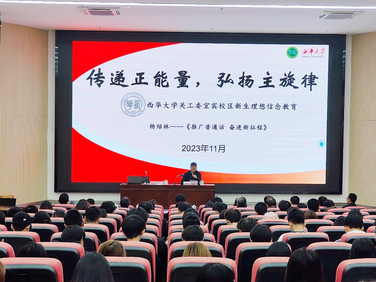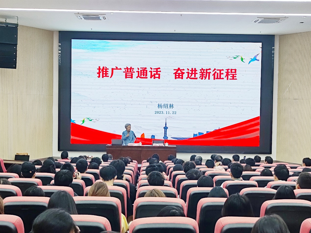 我校退休教师杨绍林教授受邀作题为《推广普通话 奋进新征程》的讲座。杨教授以风趣幽默的方式深入浅出地阐述了普通话的历史和演变、我国各地域之间的语系分布状况,以及国家为普及普通话所做的工作。她强调了在全球化背景下,从国家战略层面到学生职业发展,讲好普通话对于大学生至关重要的作用,鼓励学生在大学期间注重语言修养,努力提高普通话水平。杨教授与学生们积极互动,提问、辨音和集体朗诵等环节穿插其中,整个讲座将“‘普’雅言风,‘通’华夏情,‘话’中国梦”的主题贯穿始终。现场掌声、欢笑声不断,新生们不仅拓展了知识面,也明白了学好、讲好普通话的重要意义。