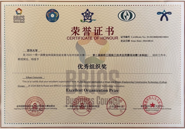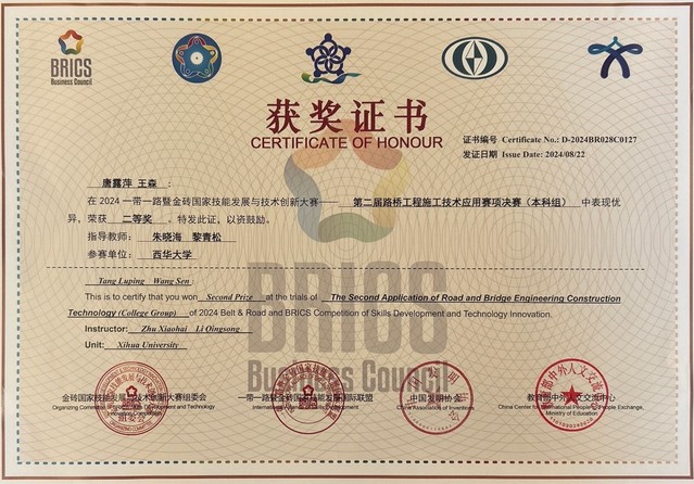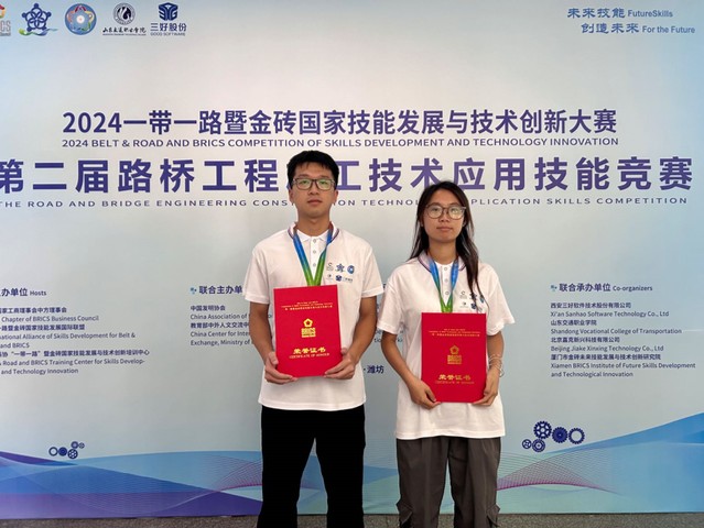 8月20日-22日,2024“一带一路”暨金砖国家技能发展与技术创新大赛——第二届路桥工程施工技术应用赛项决赛(本科组)在山东交通职业学院举行。我校汽车与交通学院交通工程专业学生唐露萍、王森(指导教师:朱晓海、黎青松)荣获全国二等奖,Betway体育西汉姆联荣获“优秀组织奖”。