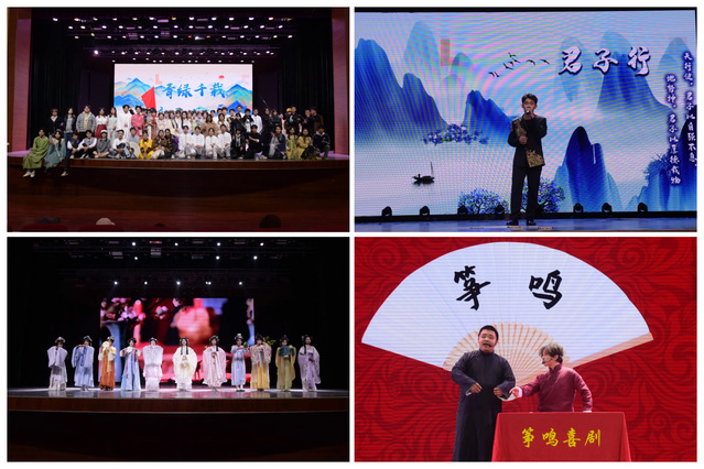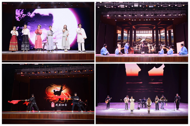 夜幕下的艺术大楼大剧场流光溢彩,校内外学生社团联袂呈现一场精彩的文化盛宴。电子科技大学筝鸣相声社以妙语连珠的相声《卖吊票》引起阵阵欢笑,西南财经大学不语配音社演绎的歌舞剧《簪花人家》传承古韵风雅,九鼎武术协会的《武影惊鸿》展示刚柔之道,服章之华汉服社的《霓裳赋》呈现跨越千年的服饰美学,墨雅民乐协会与历史文化协会联袂打造的原创情景剧《星火》点燃青年的爱国情怀……晚会现场还有乐队演唱、民族舞蹈等节目,让同学们深切领略传统文化与现代艺术的跨界融合,生动诠释新时代高校文化育人的创新实践。