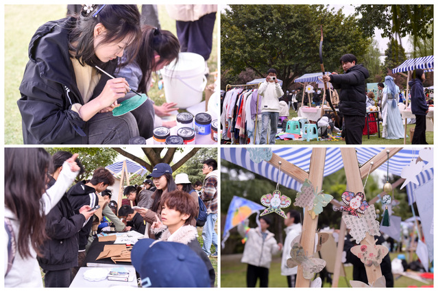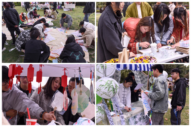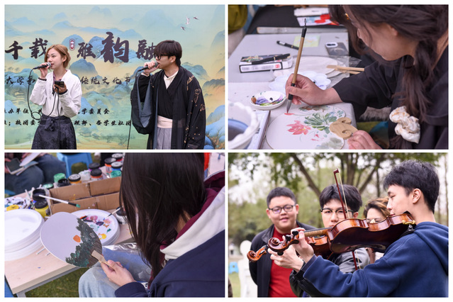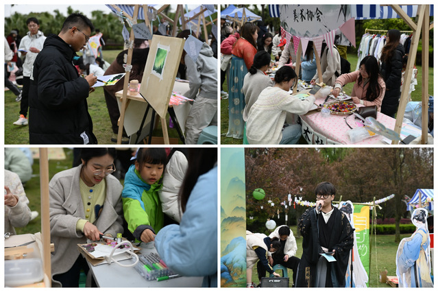 市集现场设置汉服体验区,为同学们提供不同款式的汉服、妆造及摄影服务。身着汉服的学子们在春日校园打卡留影,通过小红书、抖音等平台发布话题内容,形成线上线下联动的文化氛围。在随机表演区,音乐协会、管弦乐团、墨雅民乐协会等带来的表演赢得阵阵掌声,为市集增添青春活力。