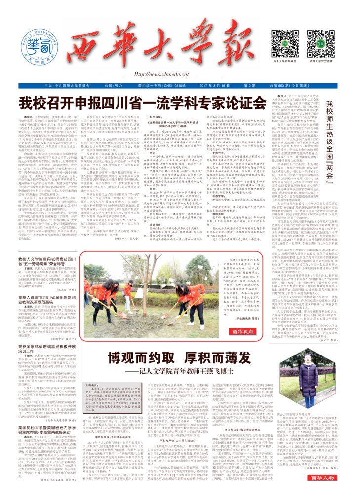 《Betway体育西汉姆联报》总第553期于3月15日正式印发,其中包含我校召开四川省一流学科专家论证会、人文学院青年教师王燕飞博士专访、西华“女神”谈“新时代女性”、我校音乐与舞蹈学院舞蹈团队参加央视春晚演出、计算机与软件工程学院软件工程专业学生陈庄专访、西西车队·初见台湾等精彩内容。