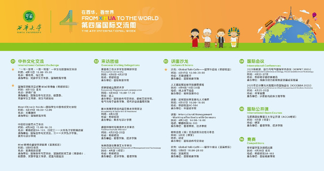 本届国际交流周以“在西华,看世界”为主题,聚焦“中外文化交流、专题讲座、来访团组、国际会议、国际公开课及竞赛活动”六大板块,融合多样形式与精彩内容,致力于打造一场集知识传播与文化体验于一体的国际嘉年华。学校将继续通过系列内容丰富、形式多样的中外交流活动,不断拓宽师生国际视野,提升跨文化理解与沟通能力,持续推动构建开放共享、互学互鉴的国际校园生态。根据工作安排,第四届国际交流周(宜宾校区)活动将于5月举办。
