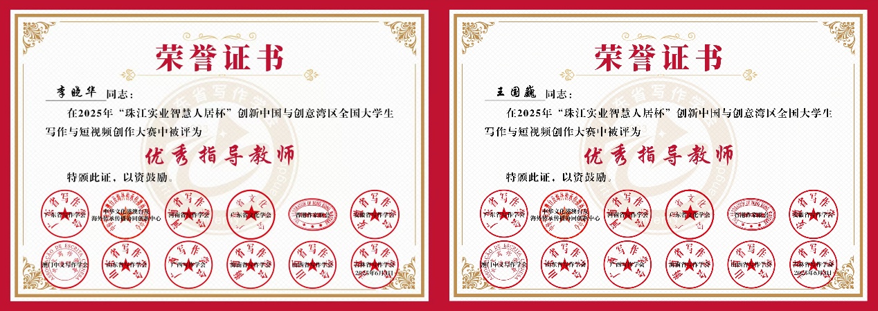 近日,2025年珠江实业智慧人居杯创新中国与创意湾区全国大学生写作大赛圆满落幕。我校学子在大赛中表现优异,共获得27个奖项,包括一等奖6项、二等奖10项、三等奖11项。文学与新闻传播学院李晓华、王国巍两位教师荣获优秀指导教师称号。