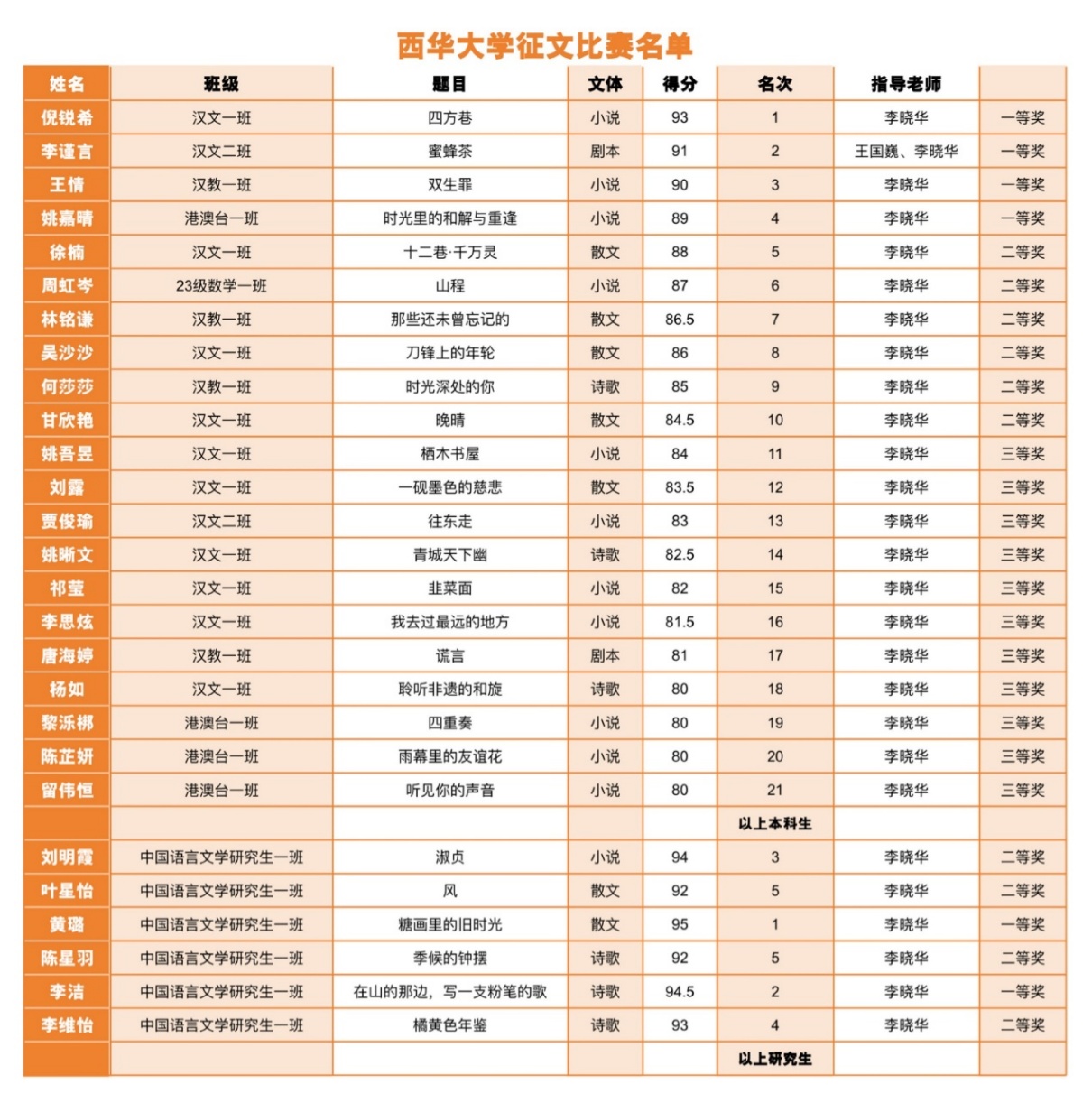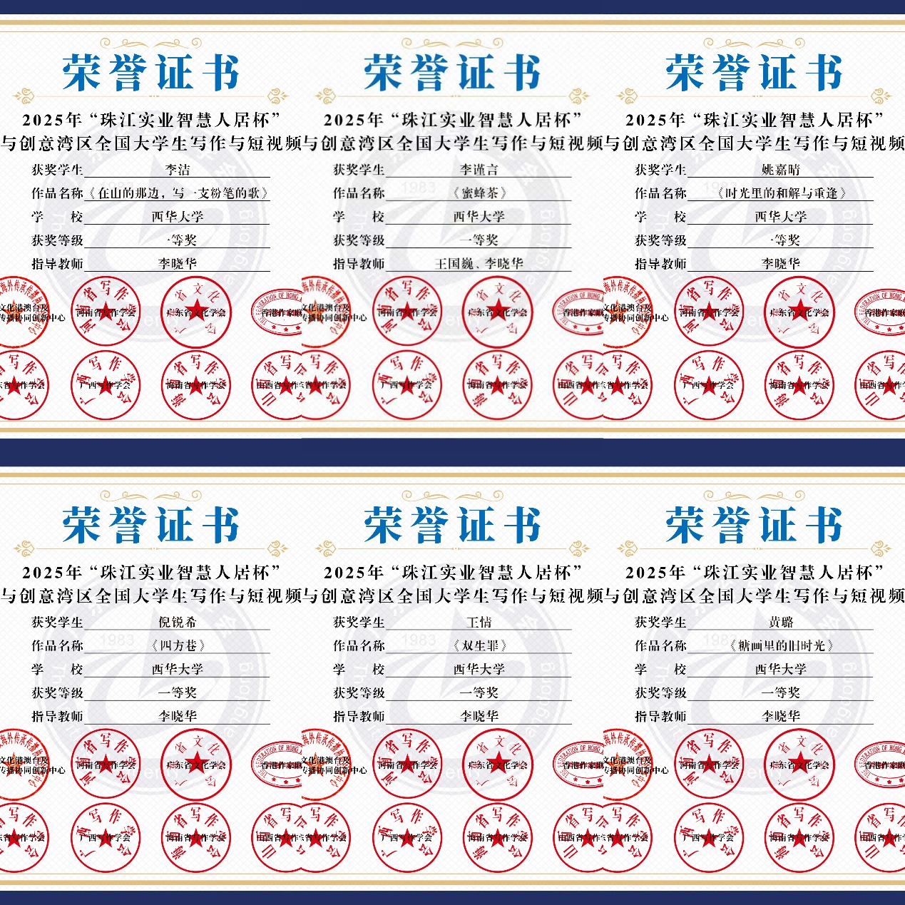 本次大赛由文学与新闻传播学院国家级线上线下混合式一流课程《写作》教学团队暨学院研究生助教团队、西华写作社共同组织备赛。在李晓华等教师的精心指导下,我校参赛学生凭借扎实的写作功底、创新的思维方式和深厚的人文素养,在比赛中脱颖而出,充分展现出西华学子扎实的语言素养与丰厚的人文底蕴。