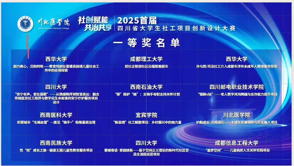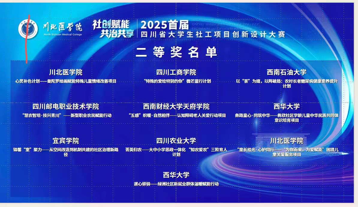 11月10日,由四川省教育厅、中共四川省委社会工作部主办的四川省大学生社会工作创新项目大赛在川北医学院圆满收官。我校社会工作与健康管理学院(心理健康教育中心)四支队伍参与决赛角逐,最终斩获一等奖2项、二等奖2项,刘婷老师等获评“优秀指导教师”。