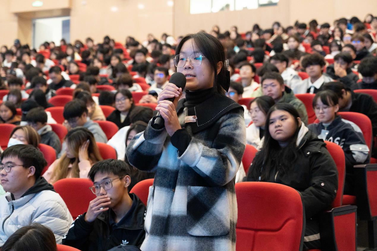 互动环节,同学们踊跃提问。在授课尾声,靳敏勉励同学们在西华这片沃土上扎根,向未来茁壮成长,在与家国共进的青春选择中,做最好的西华人,遇见最优秀的自己。