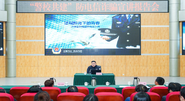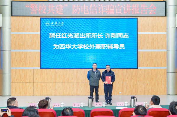 为提升大学生对电信网络诈骗的识别与防范能力,营造更加安全、清朗的校园环境,12月19日下午,“警校共建”防电信诈骗宣讲报告会在四教报告厅举行。报告会特邀郫都区红光派出所所长许刚、民警康淳森到场主讲,党委常委、副校长费凌,党委常委、副校长山述兰出席,各学院辅导员及学生代表共同聆听了这堂干货满满的防诈“必修课”。报告会由党委学生工作部部长顾鸿飞主持。