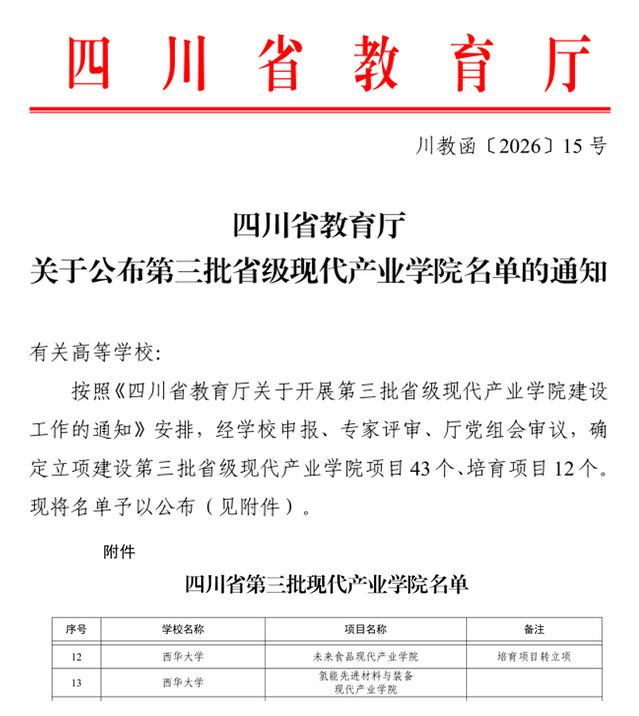 近日,四川省教育厅公布第三批省级现代产业学院名单,我校“氢能先进材料与装备现代产业学院”“未来食品现代产业学院”成功获批。至此,学校已拥有3个省级现代产业学院,标志着其在深化产教融合、服务区域产业发展方面取得新突破。