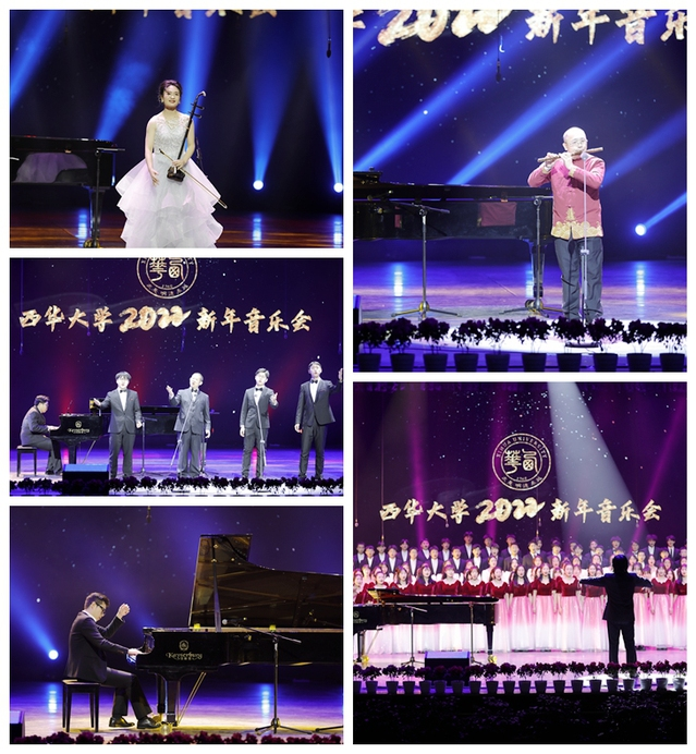 音乐与舞蹈学院师生准备的舞蹈表演、乐器演奏、独唱合唱等多种节目为观众带来了精彩的视听享受。伴随着现场师生热烈的掌声,音乐会在民乐合奏《渔歌》中拉开帷幕,西华人以动人的竹笛表达对新一年美好的展望。