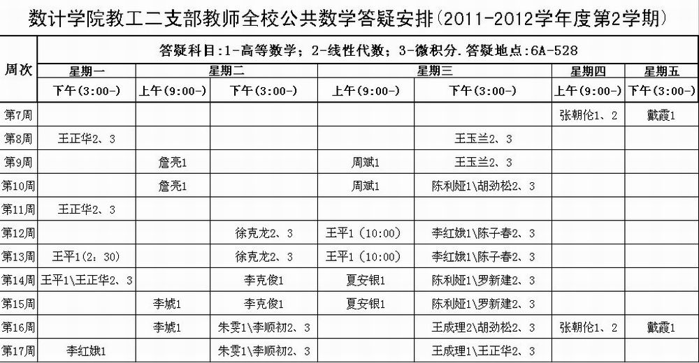 数学与计算机学院教工第二党支部响应学校和学院党委号召,认真开展创先争优基层组织建设年工作,决定从本学期第七周开始,面向全校进行公共数学答疑活动,答疑科目为高等数学、线性代数和微积分,答疑地点设在6A-528。 3月22日,学院教工第二党支部召开民主生活会。会上,支委与全体党员围绕本支部的班子建设、党员队伍发展、工作机制建立以及作用发挥等情况进行了深入分析和讨论,大家畅所欲言。 为了深入开展创先争优活动,根据应用数学系的专业特点,结合Betway体育西汉姆联开展“高等数学质量年”活动,三位支委与全体党员共同协商,决定在全校开展公共数学答疑活动,在固定时间和地点为学生答疑解惑,为整体提升我校学生数学成绩、为学生考研做出努力,并认真制订了答疑计划。无党派人士、应用数学系主任张朝伦老师表示也将积极参与全校公共数学答疑活动。 据悉,该支部全体党员表示,一定要将全校性公共数学答疑活动持续开展下去。