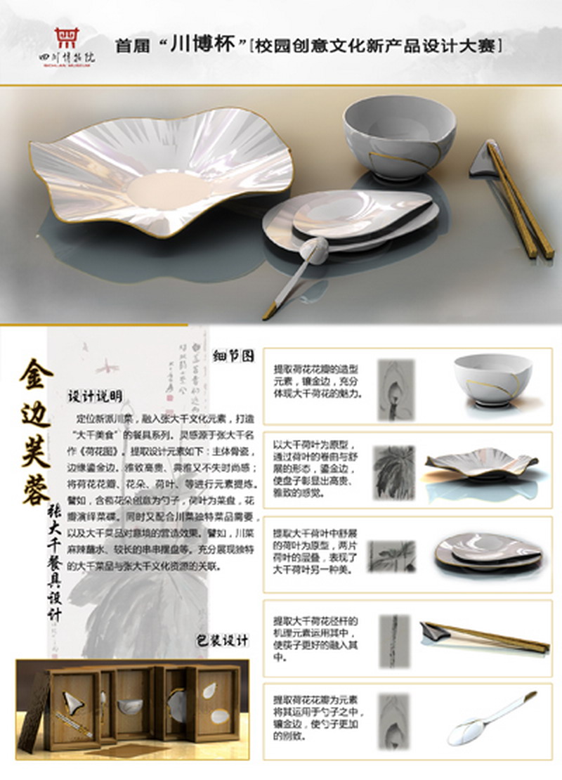 首届“川博杯”校园文化产品设计大赛于5月19日晚在四川博物院举行了盛大的颁奖典礼。来自Betway体育西汉姆联、成都理工大学、成都大学、西南民族大学等院校的60件艺术作品成功入围,颁奖典礼对获得大赛的一、二、三等奖的优秀作品进行了最高一万元人民币的现金奖励。其中,来自Betway体育西汉姆联艺术学院工业设计系的丁侃和其团队的设计作品《金边芙蓉》、李小永的设计作品《吉祥云》、杨平的设计作品《编钟笔》包揽了大赛所有的3个一等奖。此外,以张大千名作《荷花图》为灵感的“大千美食”系列餐具《金边芙蓉》还获得全场最实用设计大奖,被四川宝光文化产业发展有限公司相中,作品的设计团队受邀在颁奖典礼上进行了工作意向签约仪式。 由四川博物院主办的首届“川博杯”校园创意文化产品设计大赛在去年12月正式启动,面向省内大中专院校学生,征集以四川博物院馆藏文物或巴蜀文化为主题元素的动漫类、工业设计类、平面设计类原创作品。大赛设一等奖3名,每名奖金1万元;二等奖6名,每名奖金5000元;三等奖10名,每名奖金3000元。大赛还设有最佳人气设计奖、最佳实用设计奖,奖金各5000元。此次大赛共收到600余件参赛作品。 此次“川博杯”校园创意文化产品设计大赛是在历届四川高校文化创意比赛中规模最大,参赛人数最多,优秀作品涌现最多,奖项设立最多的一次。大赛旨在鼓励四川省青年了解并发掘巴蜀民族文化,推出新型文化创意设计产品,培育四川青年创作能力,进一步为设计爱好者和专业人士提供一个学习和交流的机会。 在本次成都诸多高校参与的竞赛中,Betway体育西汉姆联艺术学院工业设计系可谓“大获全胜”:在19个等级奖中Betway体育西汉姆联就获得了9个;在60个入围作品中,超过一半数量的作品均来自于Betway体育西汉姆联。本次设计作品主要由王崇东老师、孟凯宁老师、周睿老师进行设计指导;Betway体育西汉姆联获得了最佳组织单位奖。