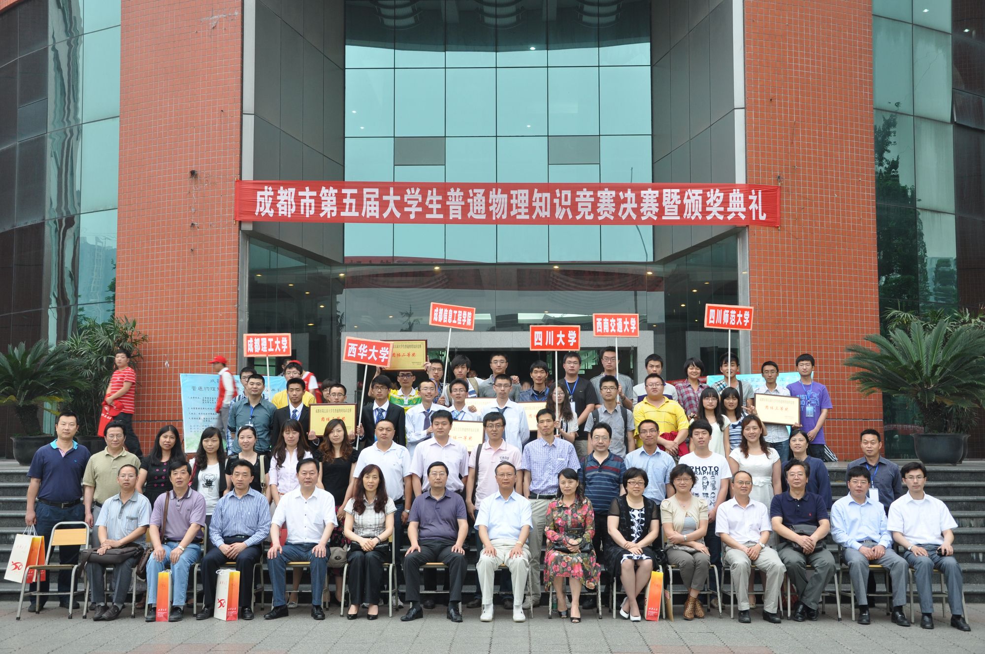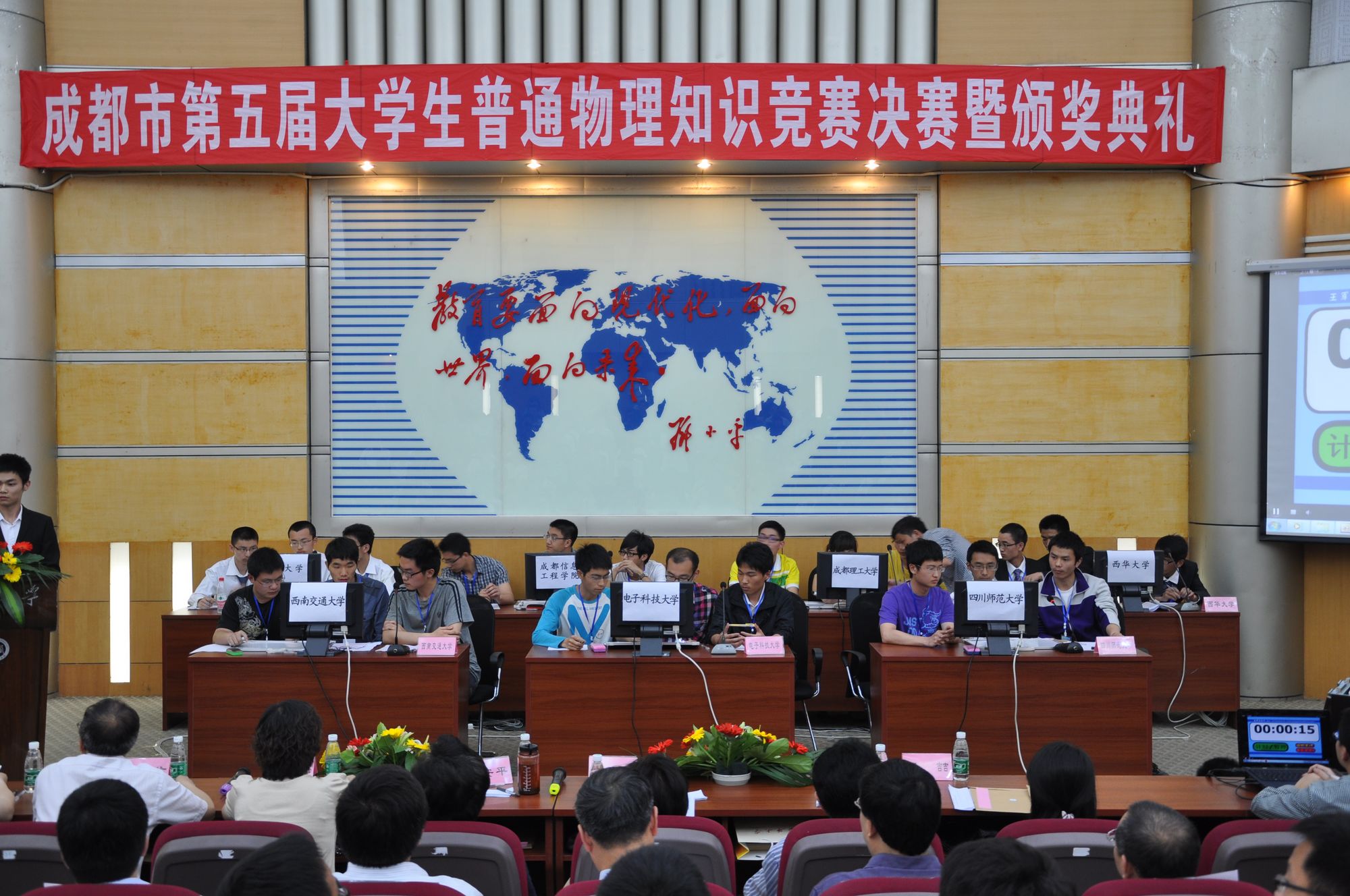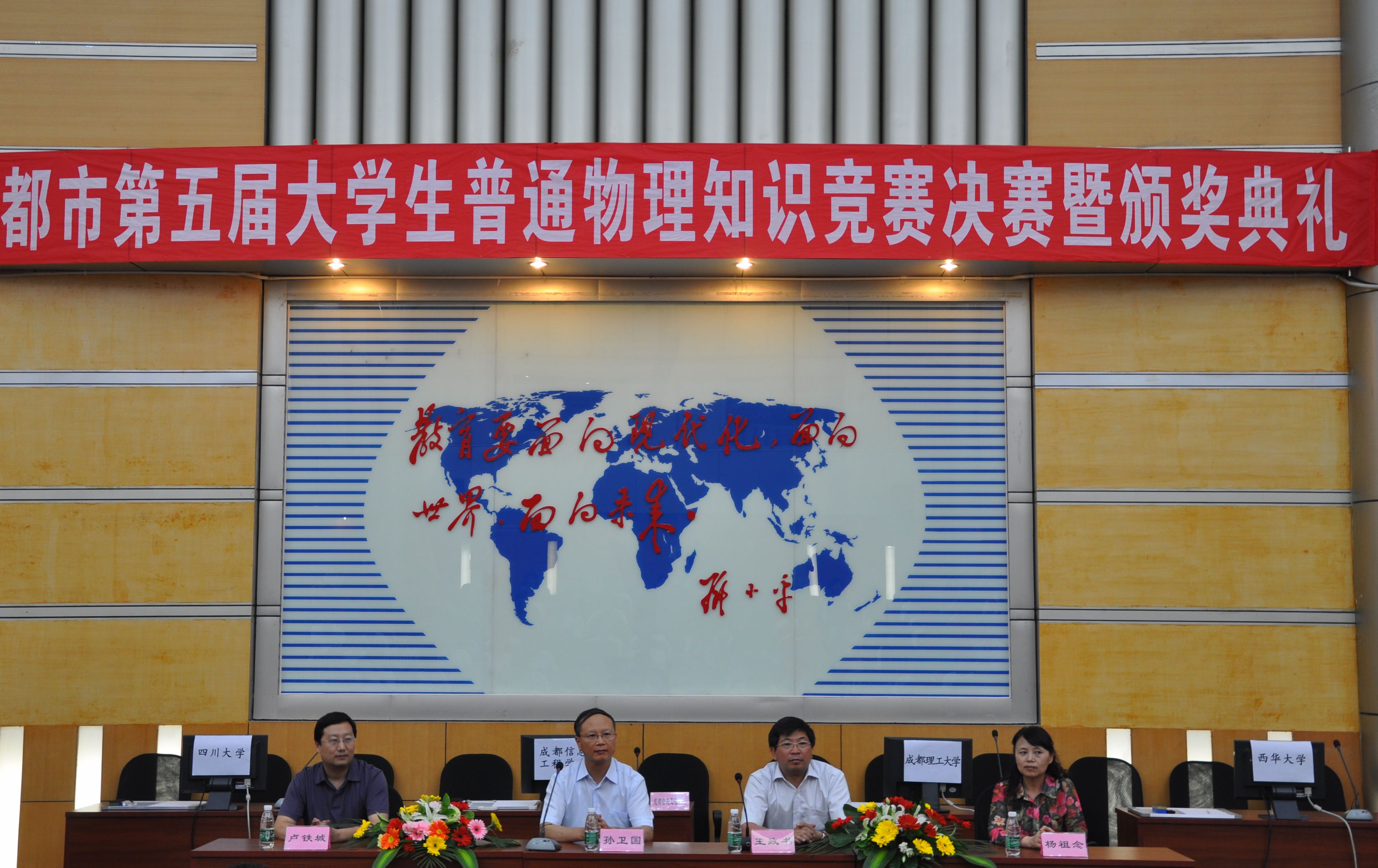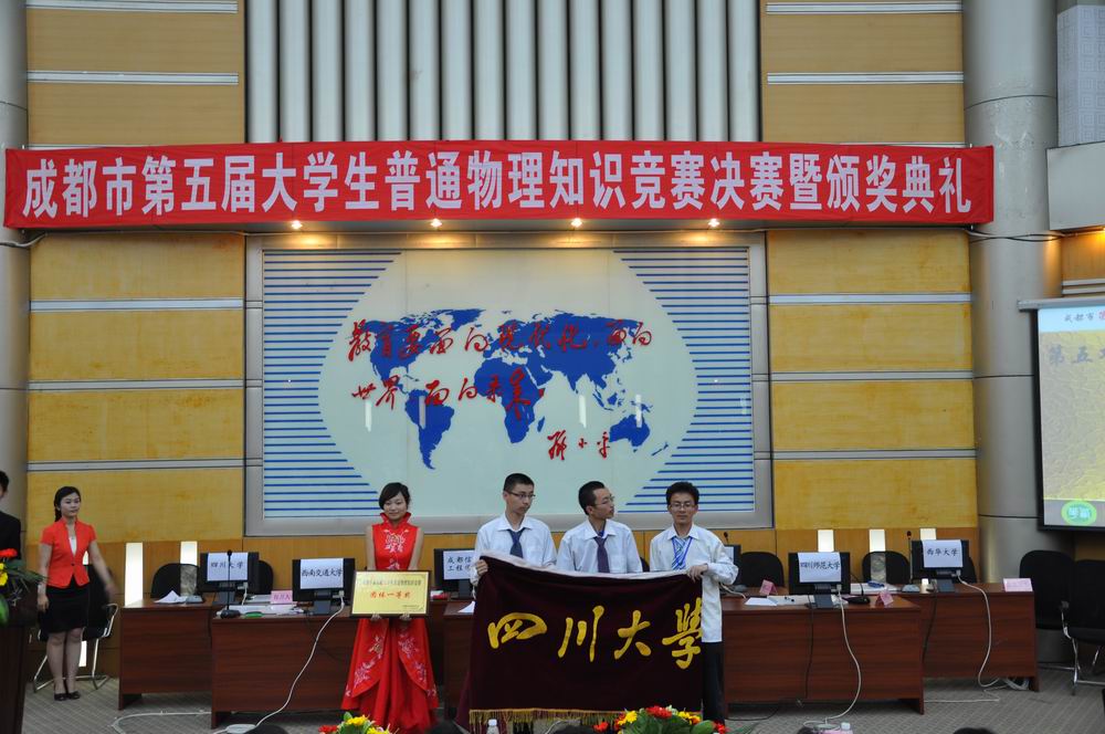 5月13日下午,成都市第五届大学生普通物理知识竞赛决赛暨颁奖典礼在我校四教报告厅举行。四川大学、电子科技大学等7所高校的代表队参加了比赛。经过激烈角逐,四川大学代表队摘得团体桂冠,我校代表队获得团体三等奖。 四川省物理学会副理事长、Betway体育西汉姆联校长孙卫国,成都市物理学会理事长、四川大学科学技术发展研究院副院长卢铁城,成都市物理学会副理事长杨祖念,Betway体育西汉姆联副校长王政书,成都市第五届大学生普通物理知识竞赛组委会相关领导、评审专家以及来所有参赛队的指导老师参加了开幕式。 校长孙卫国致开幕词。他代表学校对大赛组委会的信任和支持表示衷心的感谢,对各位领导和专家莅临我校指导工作表示诚挚的谢意,对全省各兄弟高校参赛队伍的指导老师和同学们的到来表示热烈的欢迎。孙校长希望通过比赛,能诞生更多年轻的物理学家,为国家建设、科学事业的发展做出贡献。 本次决赛共分三个环节进行。第一环节为选择填空题部分,第二环节为简析答题,第三环节为现象解释题。经过激烈角逐,四川大学夺得团体一等奖,成都理工大学、电子科技大学获团体二等奖;Betway体育西汉姆联、四川师范大学、成都信息工程学院、西南交通大学获得团体三等奖。孙卫国校长,成都市物理学会理事长、四川大学科学技术发展研究院副院长卢铁城等分别为获奖团队颁奖。 颁奖仪式结束后,卢铁城理事长致闭幕词。他希望同学们通过比赛,能更喜欢物理、热爱物理,并把所学的物理知识运用到日常生活之中,实实在在地解决问题。 成都信息工程学院光电技术学院党总支书记向安平,成都理工大学地球物理学院应用物理系张正阶教授,四川大学物理科学与技术学院张软玉副教授,Betway体育西汉姆联物理与化学学院大学物理教学部主任王时建,电子科技大学物理电子学院物理中心副主任吴喆,西南交通大学物理科学与技术学院副院长吴平,四川师范大学物理与电子工程学院熊天信教授担任本次比赛的评委。 成都市第五届大学生普通物理知识竞赛由我校物理与化学学院承办。  开幕式 参赛同学正在认真答题