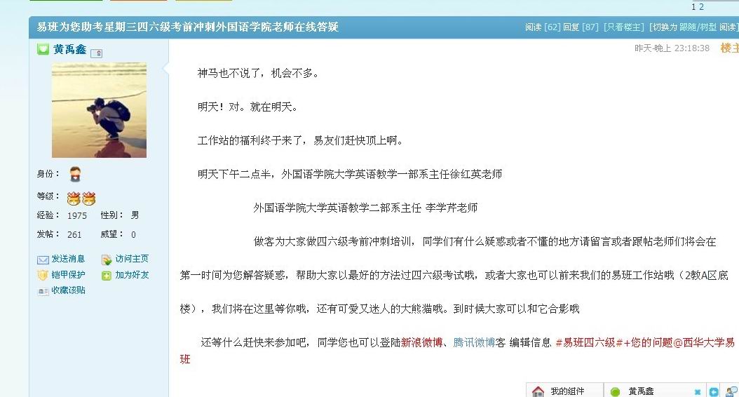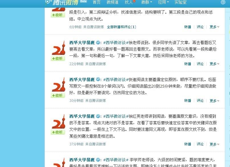 6月13日下午,由Betway体育西汉姆联易班工作站、外国语学院和机械工程与自动化学院联合举办的首届易班四六级考前冲刺辅导成功举行。 全国大学英语四、六级等级考试近在眼前,部分同学对四六级考试存在着疑惑。为帮助同学们解决在四六级考试应考过程中遇到的困难,13日下午2点30分,外国语学院徐红英老师、李学芹老师和部分“英语考试达人”应邀来到二教底楼的Betway体育西汉姆联易班工作站,与机械学院2011级同学和易班学生工作站的全体成员进行了交流。本次冲刺辅导同时以座谈、微博、易班在线论坛问答等新颖方式展开,为全校同学解答四、六级考试疑问。 徐红英和李学芹老师在分析了考试题型后,重点向同学们讲解了听力考试技巧。李老师说:“听力在四级考试中占有很大比重,做好听力试题至关重要。除了掌握必要的做题技巧外,听力还主要依靠平时积累,每天半小时的听力训练对听力会有很大的帮助。”接下来,两位老师对阅读、作文、完型填空、选词填空、句子翻译等方面进行了十分详细讲解。 徐红英老师通过结合2011年12月四级考试真题向同学们讲解了答题和得分技巧。徐老师强调:“通过分析发现,我校许多考生都因为几分的差距而没有达到分数线,这是很可惜的。同学们不应该放弃试题的任何一部分和任何得分的机会。” 同时,两位老师还解答了在场同学以及同学们在微博、易班论坛等提出的问题。外国语学院的两位“考试达人”通过自己参加公共英语四级考试的经验,与同学们分享了自己的考试技巧。 参与本次咨询辅导活动的同学们在收获知识、技能的同时,还收获了易班工作站赠送的精美礼物——易班T恤。